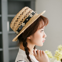 ELEVENCC拉菲草帽帽子女夏天韩版潮镂空花朵平顶沙滩帽防晒遮阳帽