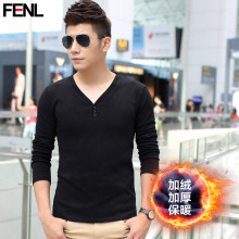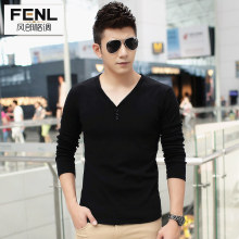 FENL2017秋季新款长袖t恤男秋纽扣衣服V领男装纯色欧美风潮修身装