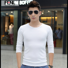 FENL男装长袖t恤棉圆领修身纯色春秋季青年紧身打底衣服装纯白色