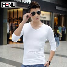 FENL长袖t恤男棉V领修身纯色春秋季男装秋冬衣服装纯白色紧身打底
