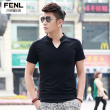 Fenl夏季男装鸡心领短袖t恤男V领立领polo衫修身纯色社会小伙衣服