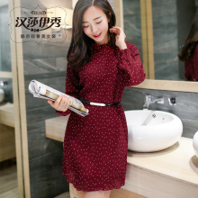 汉莎伊秀2017春装新款气质花边领修身显瘦波点雪纺连衣裙中长款