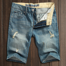 逸客夏季潮男时尚做旧破磨烂洞牛仔裤小直筒中裤五分裤5分短裤子