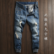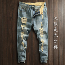 逸客夏季潮流做旧时尚男士补丁破洞牛仔裤小脚裤子韩版修身束脚裤