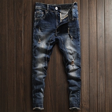 逸客秋冬装新品潮男做旧破洞牛仔裤弹力小脚低档微垮裤哈伦束脚裤