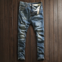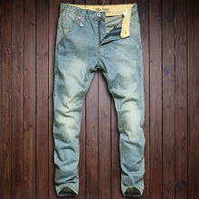 逸客秋装新品猫须做旧黄水洗磨烂破洞时尚男士小直筒牛仔裤长裤子