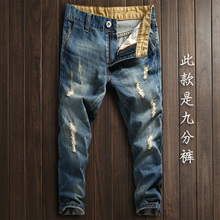 逸客夏季新品浅色潮流男士修身破洞九分牛仔裤9分裤收脚束腿裤子