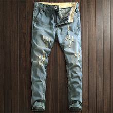 新款春夏装浅蓝色油漆点破洞男士牛仔裤修身型潮男薄款牛仔长裤子