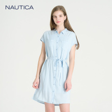 nautica/诺帝卡夏季新款淑女小翻领纯色收腰短袖连衣裙女NA001116