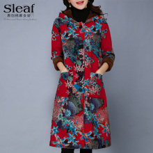 草莓叶民族风印花2017冬装新款棉衣女外套中长款连帽大码加绒棉服