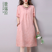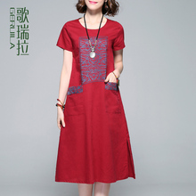 歌瑞拉2017夏装新品棉麻风连衣裙大码中长裙民族风刺绣复古长袍子