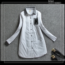 欧洲站16秋冬大码休闲加绒中长款白衬衫女长袖纯色加厚衬衣打底衫