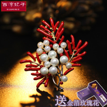 EVA颐娲 韩版母贝珍珠红珊瑚胸针 胸花 红杉树叶风花雪月款气质女