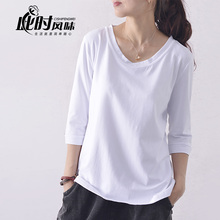 此时原创 细腻精梳纯棉t恤七分袖女款春 宽松纯白色打底衫中长款
