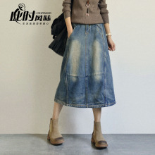 此时原创 森女文艺牛仔a字裙 中长款半身裙 高腰复古休闲长裙春秋