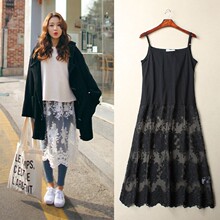 外贸原单韩国复古修身显瘦镂空透视超长打底连衣裙蕾丝网纱吊带裙