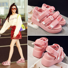 2017夏季新款运动魔术贴坡跟凉鞋女学生夏百搭休闲韩版松糕跟凉鞋