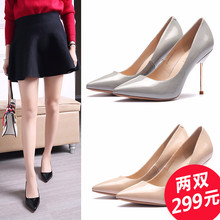 春秋女鞋韩版百搭尖头单鞋女黑色银色高跟鞋女细跟春秋鞋有34码