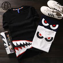 夏天日系复古港风衣服鲨鱼嘴卡通印花短袖T恤男 潮牌半截袖打底衫