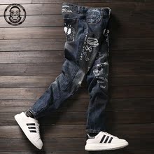 秋冬新款日系潮牌复古裤子男大码宽松牛仔裤涂鸦油漆破洞小脚裤男