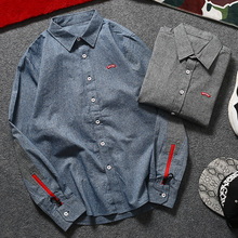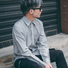 港风秋季新款日系潮男复古简约长袖衬衫男青少年方领刺绣打底衬衣