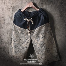 胖子男装夏 麻棉 日系原宿拼接短裤民族风休闲亚麻五分裤 短裤男