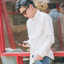 日系复古衬衣潮男青少年泼墨刺绣长袖衬衫男翻领宽松休闲百搭寸衣