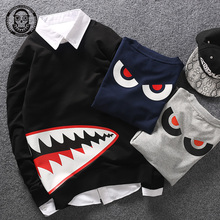 日系潮牌衣服男圆领套头复古原宿卫衣男青年加厚鲨鱼印花长袖外套