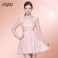 百依秀子 2015春款蕾丝小香风欧根纱拼接长袖刺绣气质连衣裙 B981