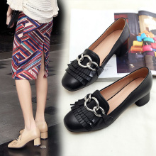 单鞋女 中跟2017春季新款方头金属链条流失真皮黑色百搭女式鞋子