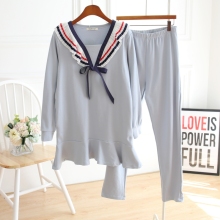 宅格调秋冬季加厚磨毛纯棉学院海军风蝴蝶结长款长袖女睡衣家居服