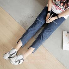 韩国代购孕妇17春新破洞艺术韩范流行宽松托腹牛仔裤9分直筒裤