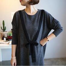 现货韩国代购孕妇装17春款韩版宽松长袖棉质舒适蝴蝶结优雅连衣裙