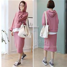 韩国代购孕妇装17春季新款纯色带帽哺乳卫衣+半身裙2件哺乳套装