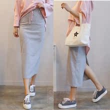 韩国代购孕妇装17春装新款螺纹棉修身抽绳松紧腰中长款一步半身裙