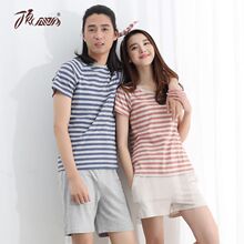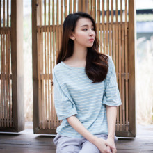 2016新款春女士夏条纹中袖五分短袖中裤家居服套装睡衣顶呱呱彩棉