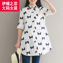 加大码女装2017春夏文艺印花蝴蝶结小清新衬衣 胖MM宽松衬衫200斤