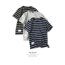 BJHG夏欧美简约百搭纯色弹力条纹印花圆领短袖T恤潮男半袖体恤Tee