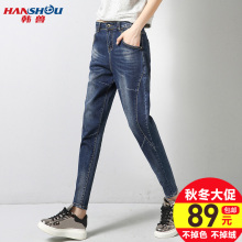 韩兽2016春夏新品破洞牛仔裤女九分裤宽松小脚哈伦裤胖mm乞丐长裤
