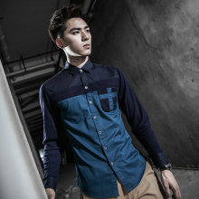 秋季男士长袖衬衫韩版修身纯棉薄款学生青年牛津纺衬衣拼接休闲潮