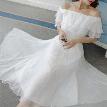 香步露肩雪纺连衣裙夏季新款2017韩版一字肩收腰仙气中长款A字裙