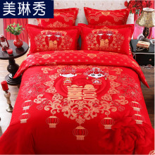 美琳秀床上用品婚庆四件套夏季大红双人床单被罩纯棉全棉结婚被套