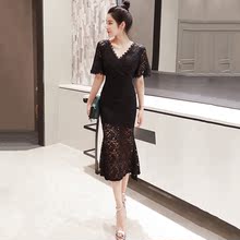 气质名媛长裙蕾丝连衣裙2017春夏新款短袖修身开叉旗袍礼服裙子潮