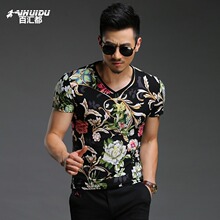 冰丝绒短袖T恤男 夏季透气潮印花发型师夜店V领修身男士t恤男大码