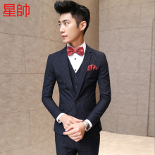 春秋季发型师条纹西装男士韩版修身新郎结婚礼服伴郎西服三件套装