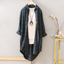 大码棉麻格子衬衫女中长款春装新款韩版外套长袖衬衣亚麻上衣