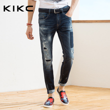 kikc男装 2017春夏专柜新款破洞补丁水洗牛仔裤修身锥形长裤