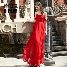 D-PLAY春夏新品红色长裙雪纺裙吊带连衣裙开叉度假沙滩裙礼服裙