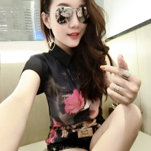欧洲站夏装新款时尚印花衬衫女短袖雪纺衫短款衬衣百搭显瘦上衣潮