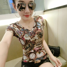 欧洲站夏季新款个性印花短袖t恤女修身显瘦V领打底小衫百搭上衣潮